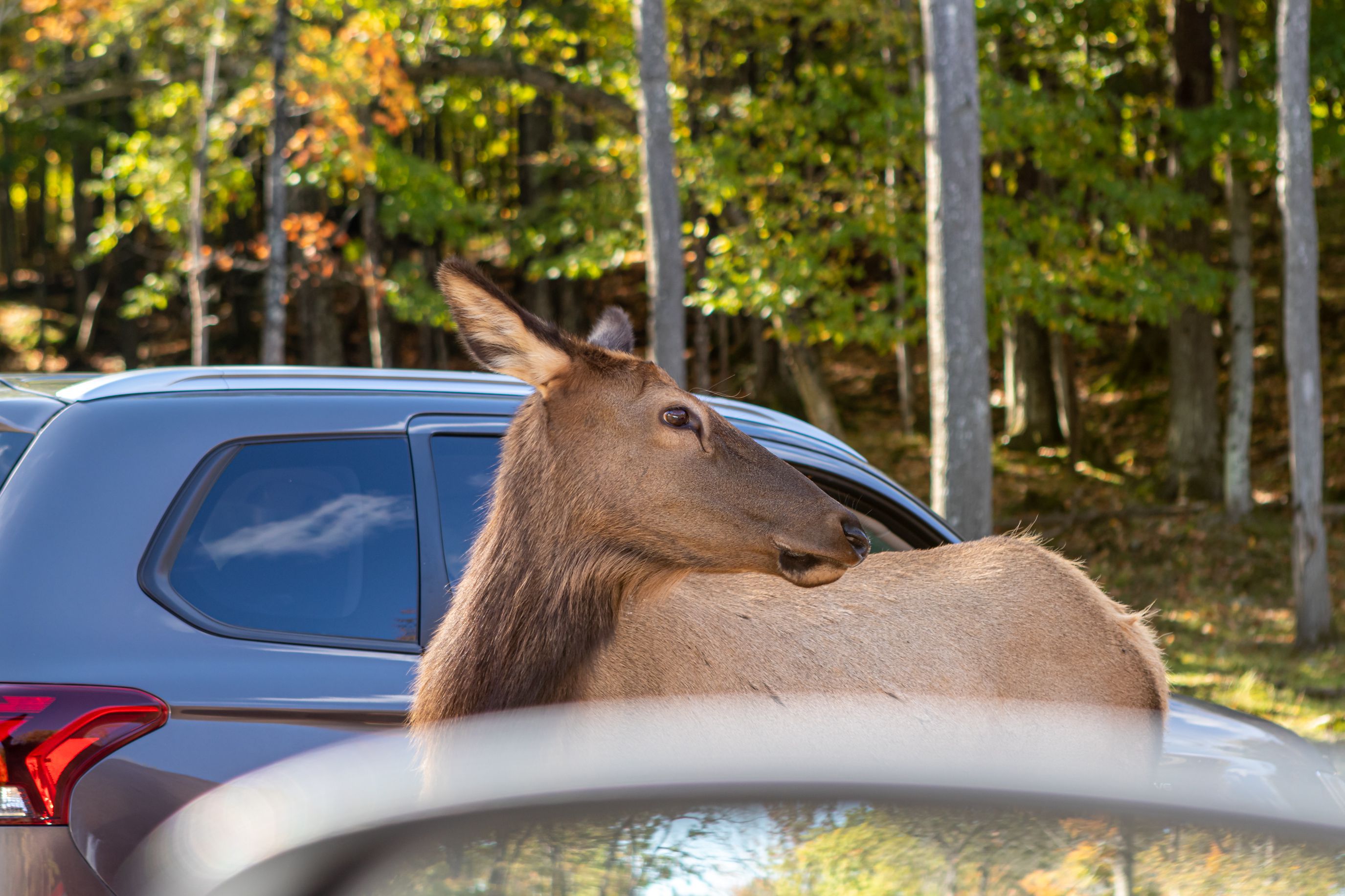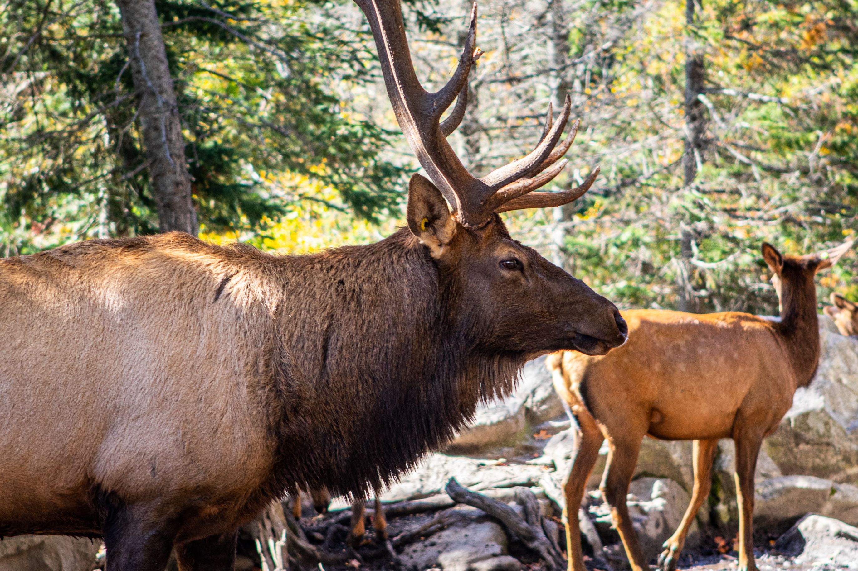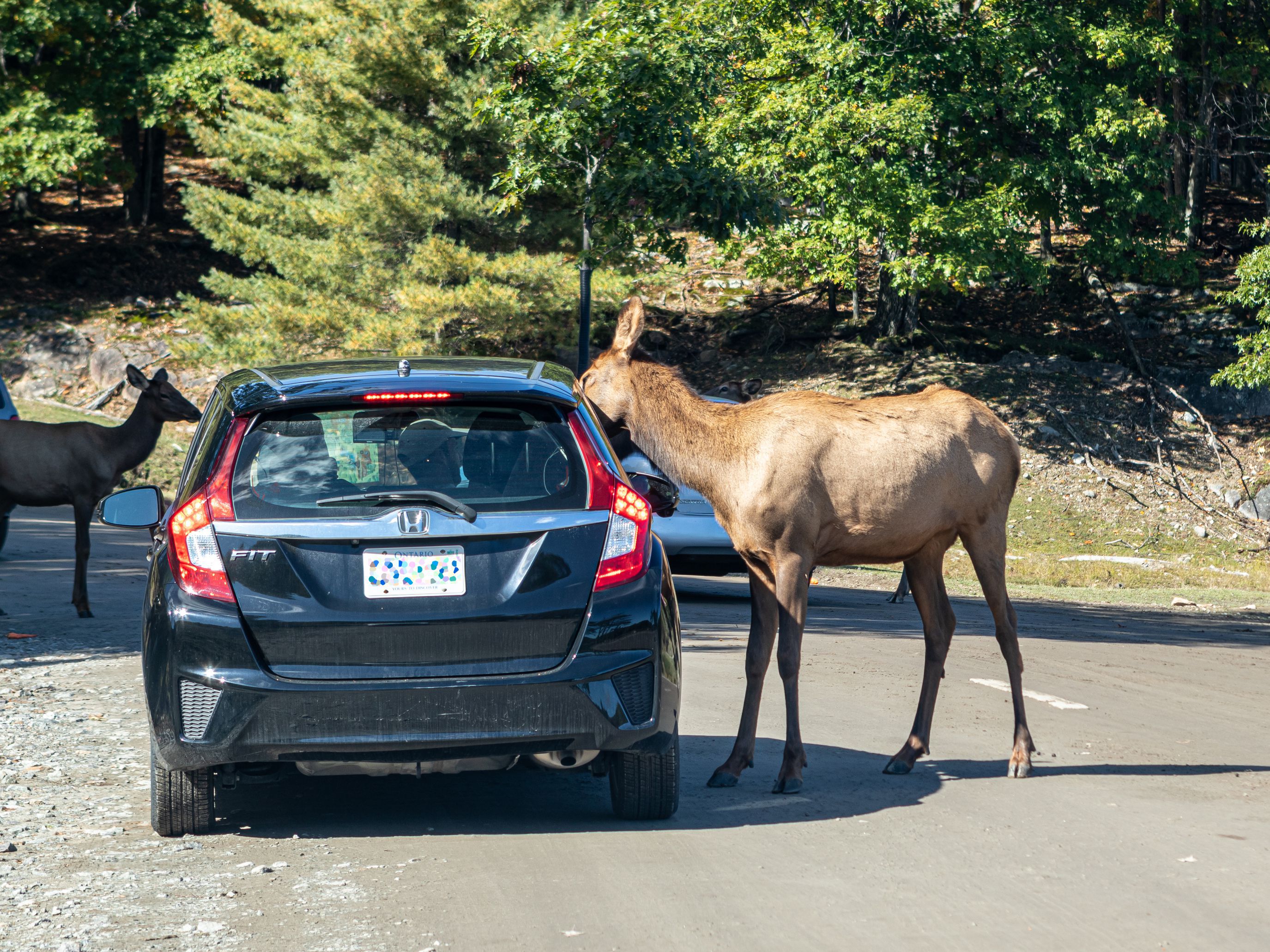 A noter que c'est la période du rut des mâles, et un panneau indiquait de ne pas s'en approcher ! Autant dire que c'est compliqué d'esquiver un animal large comme une voiture au milieu d'un chemin ... (et des gens s’arrêtant pour nourrir tous les animaux ... ! )