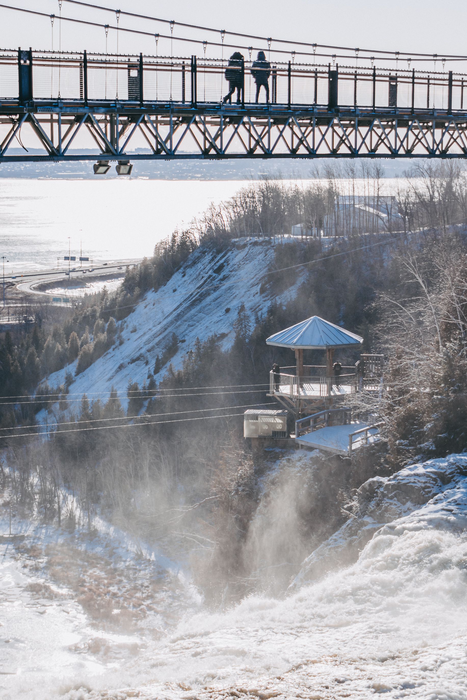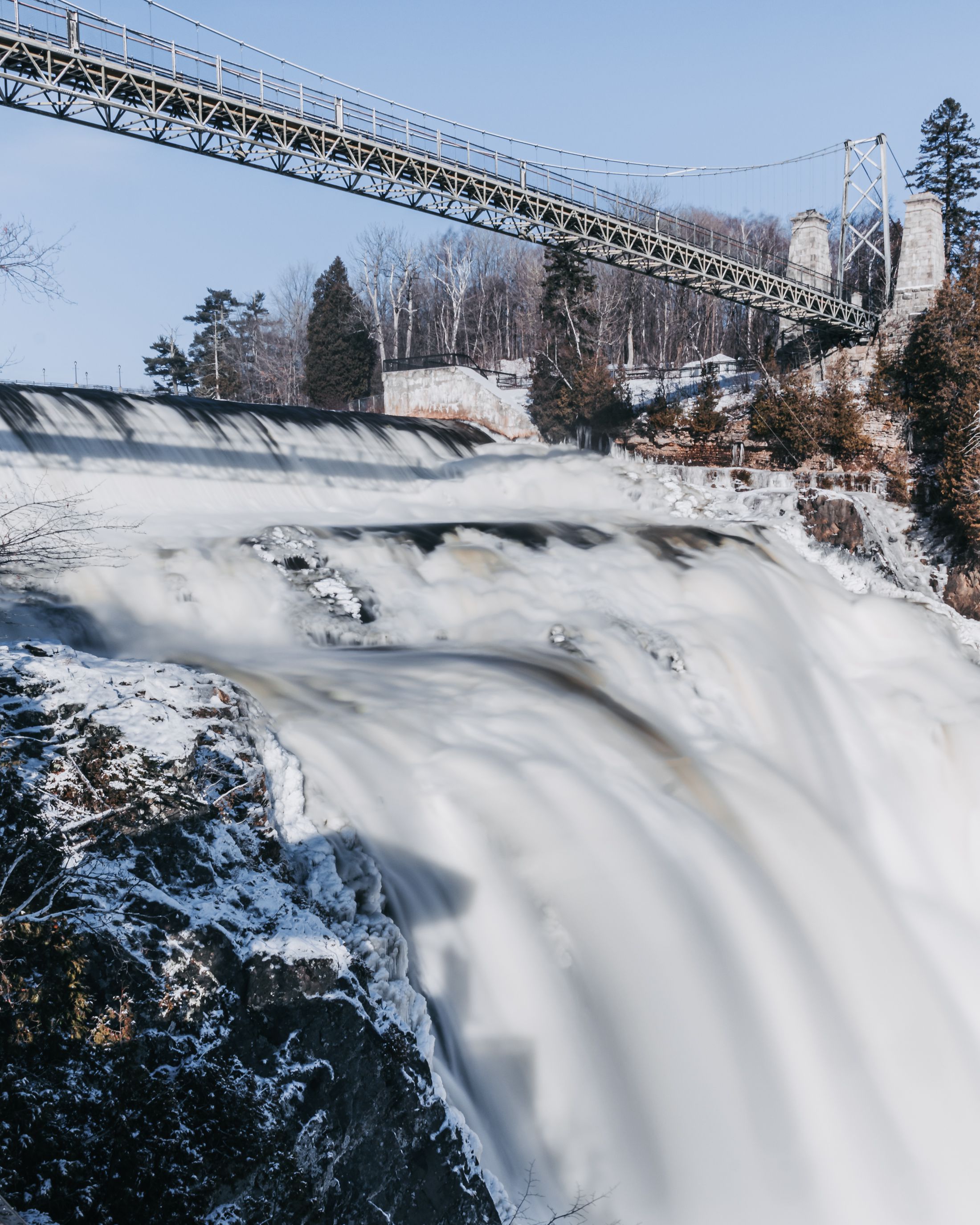 L'embouchure de la rivière Montmorency se déverse en falaise dans le fleuve Saint-Laurent. La chute, d'une hauteur de 83 mètres, est la plus haute de la province du Québec et dépasse de trente mètres les chutes du Niagara ! (Wikipedia)